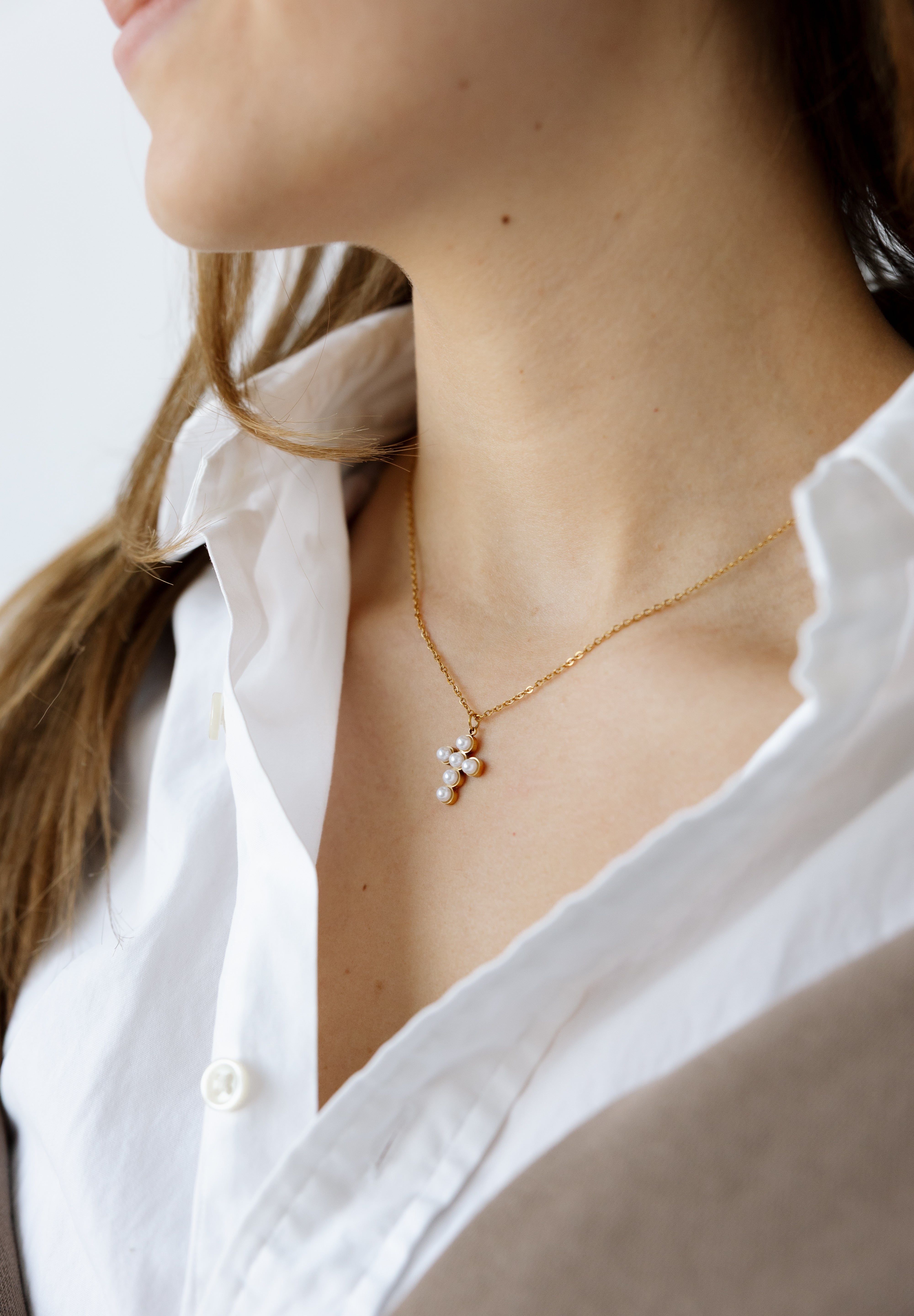 Small but mighty, the Sophia Pearl Cross Necklace is a beautiful blend of coastal elegance and Christian symbolism.